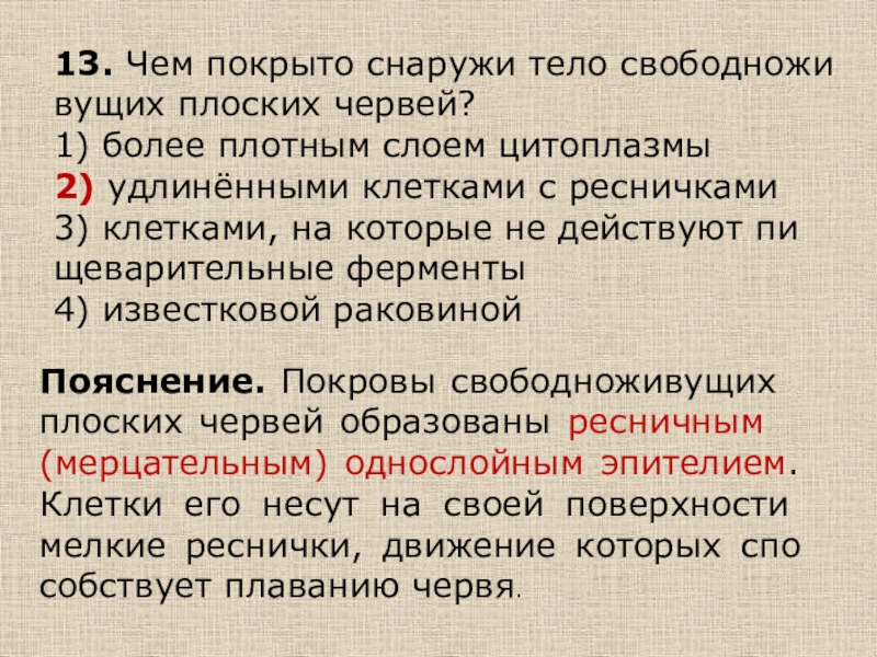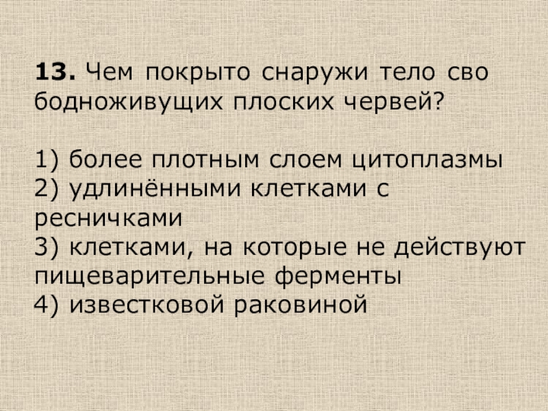 Слайд 8113. Чем покрыто снаружи тело свободноживущих плоских червей?