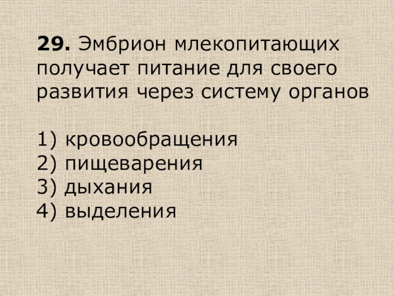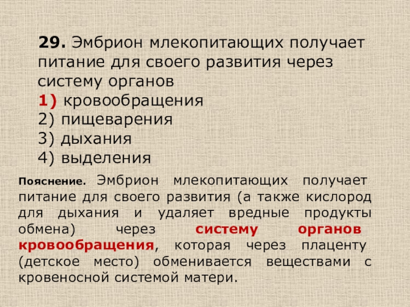 Слайд 9729. Эмбрион млекопитающих получает питание для своего развития через систему органов