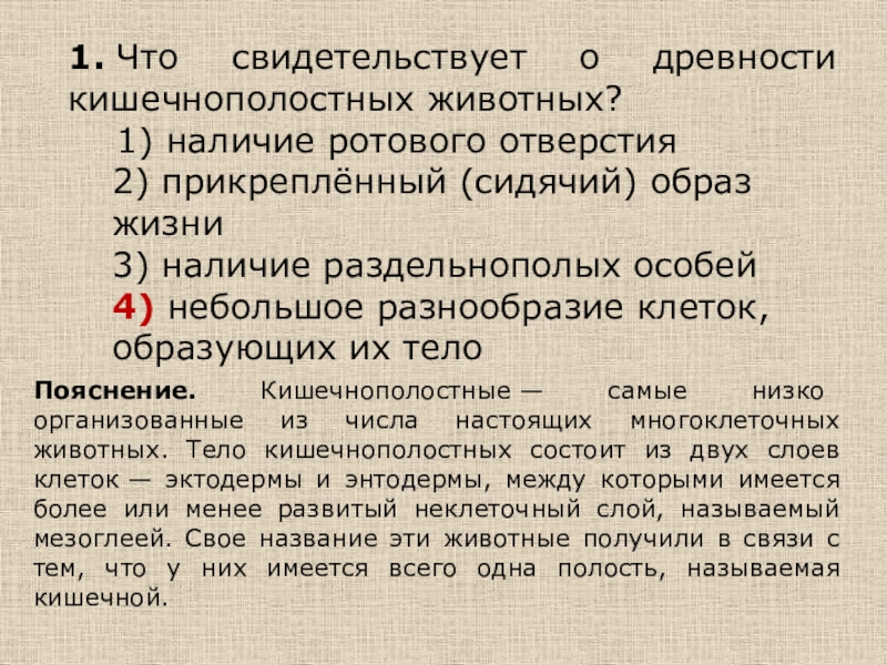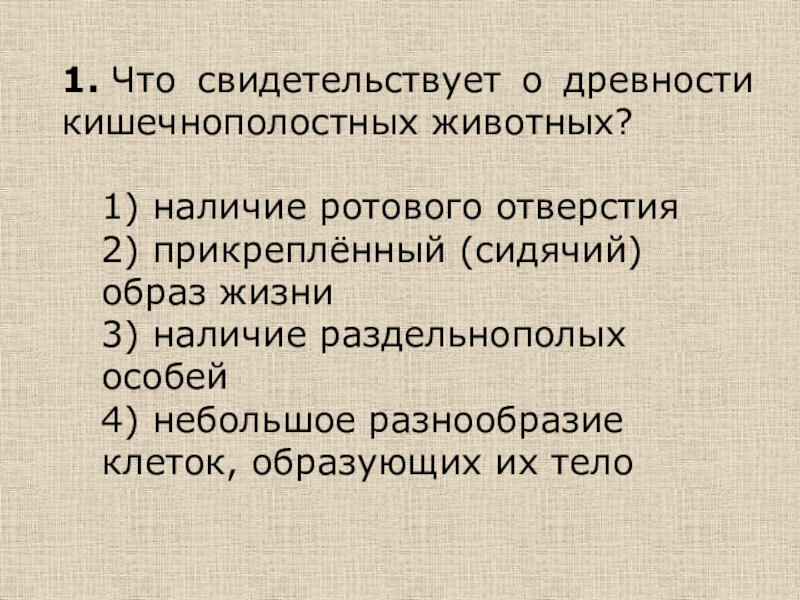 Слайд 281. Что свидетельствует о древности кишечнополостных животных?