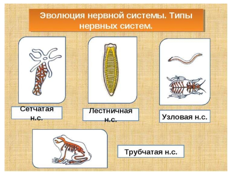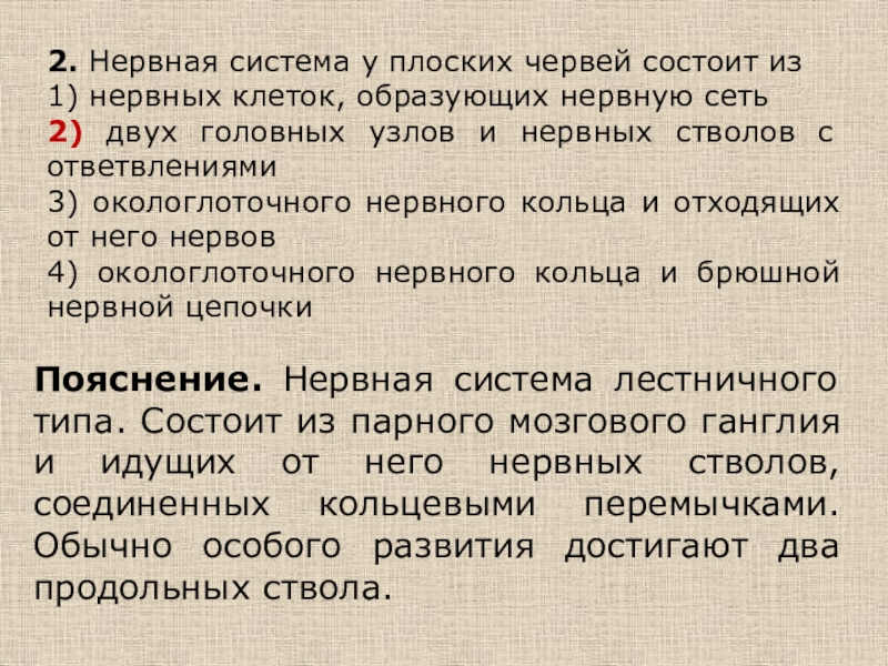Пояснение. Нервная система лестничного типа. Состоит из парного мозгового ганглия и идущих от него нервных стволов, соединенных кольцевыми перемычками. Обычно особого развития достигают два продольных ствола.