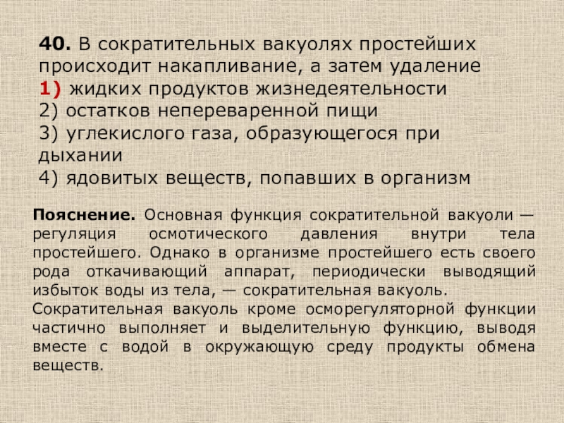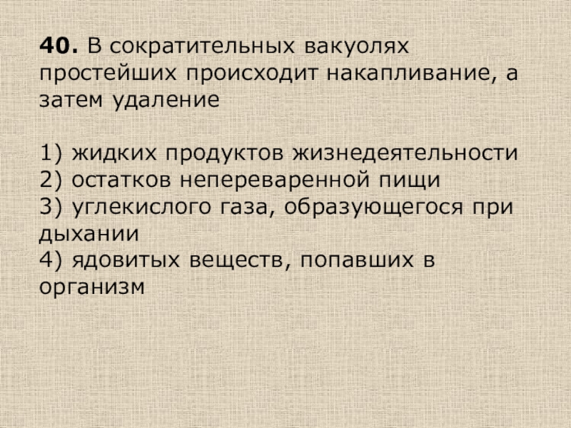 Слайд 6740. В сократительных вакуолях простейших происходит накапливание, а затем удаление