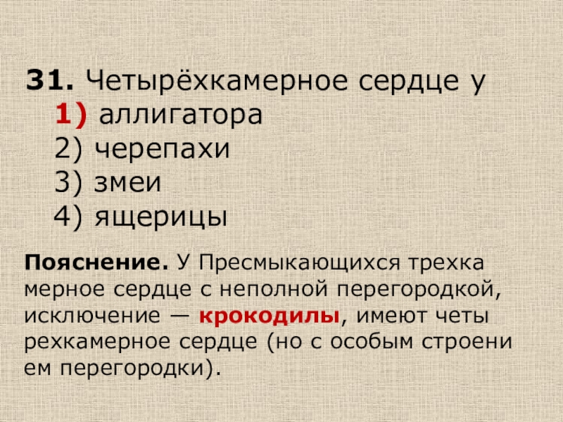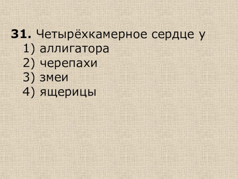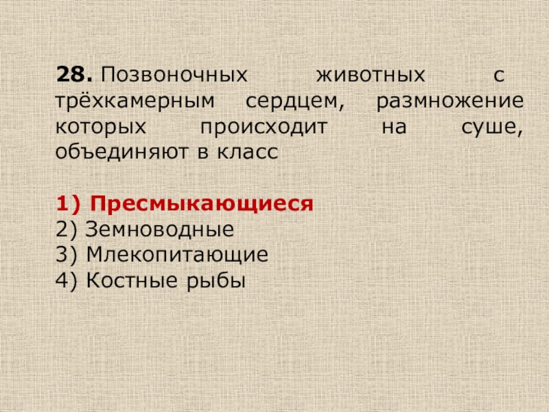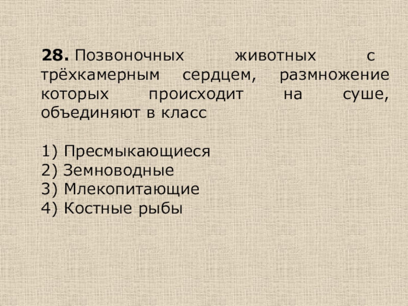 Слайд 9628. Позвоночных животных с трёхкамерным сердцем, размножение которых происходит на суше, объединяют