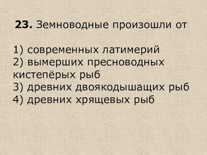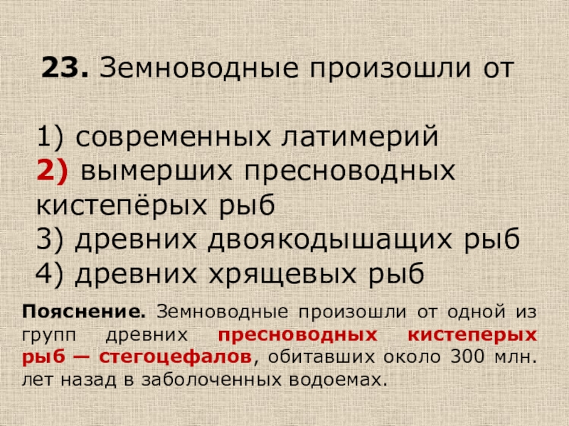 Пояснение. Земноводные произошли от одной из групп древних пресноводных кистеперых рыб — стегоцефалов, обитавших около 300 млн. лет назад в заболоченных водоемах.