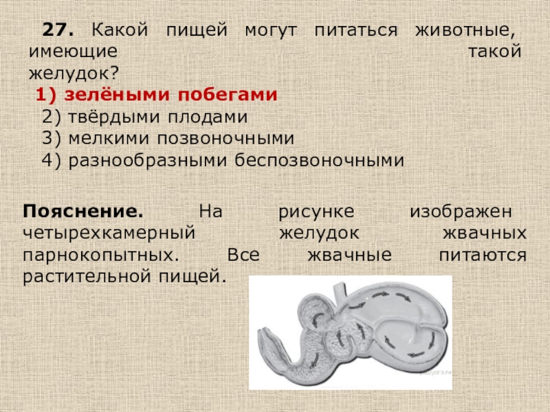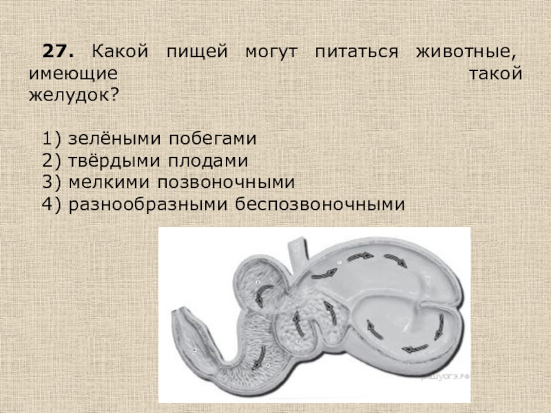 Слайд 9527. Какой пищей могут питаться животные, имеющие такой желудок? 1) зелёными