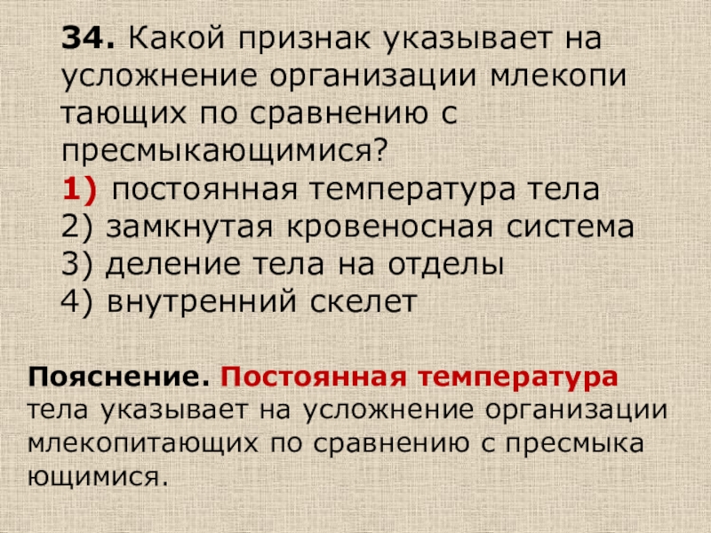 Пояснение. Постоянная температура тела указывает на усложнение организации млекопитающих по сравнению с пресмыкающимися.