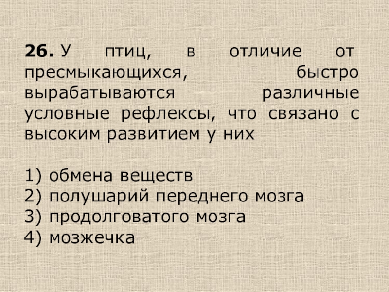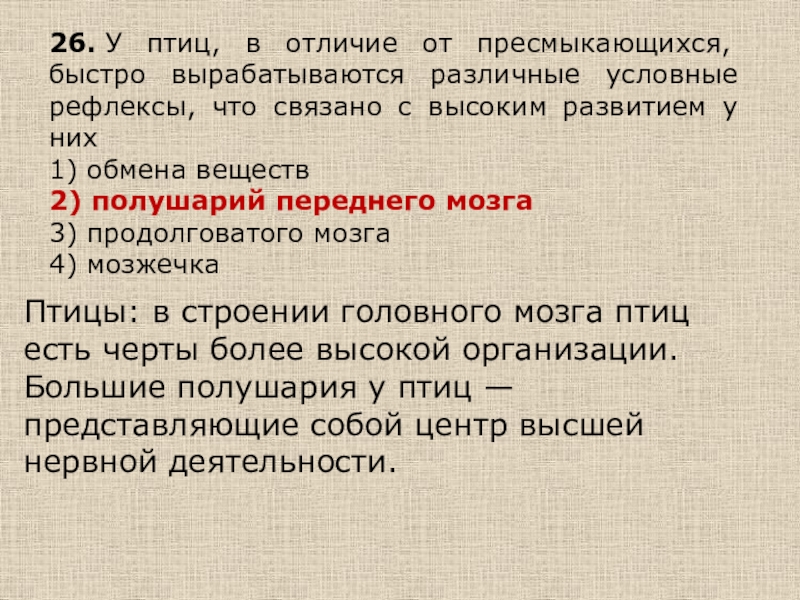 Слайд 9426. У птиц, в отличие от пресмыкающихся, быстро вырабатываются различные условные рефлексы,