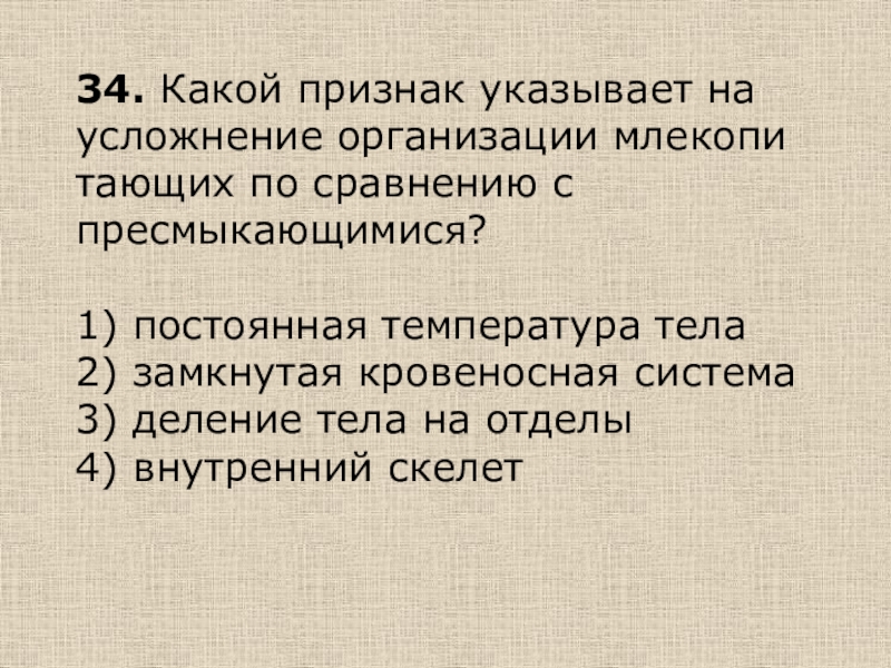 Слайд 10234. Какой признак указывает на усложнение организации млекопитающих по сравнению с пресмыкающимися?