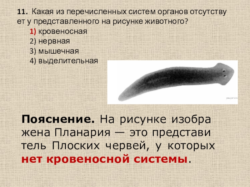 Пояснение. На рисунке изображена Планария — это представитель Плоских червей, у которых нет кровеносной системы.