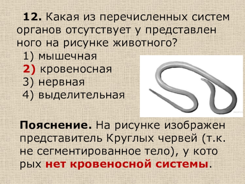 Пояснение. На рисунке изображен представитель Круглых червей (т.к. не сегментированное тело), у которых нет кровеносной системы.