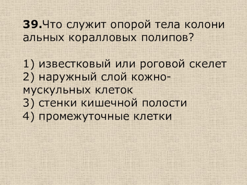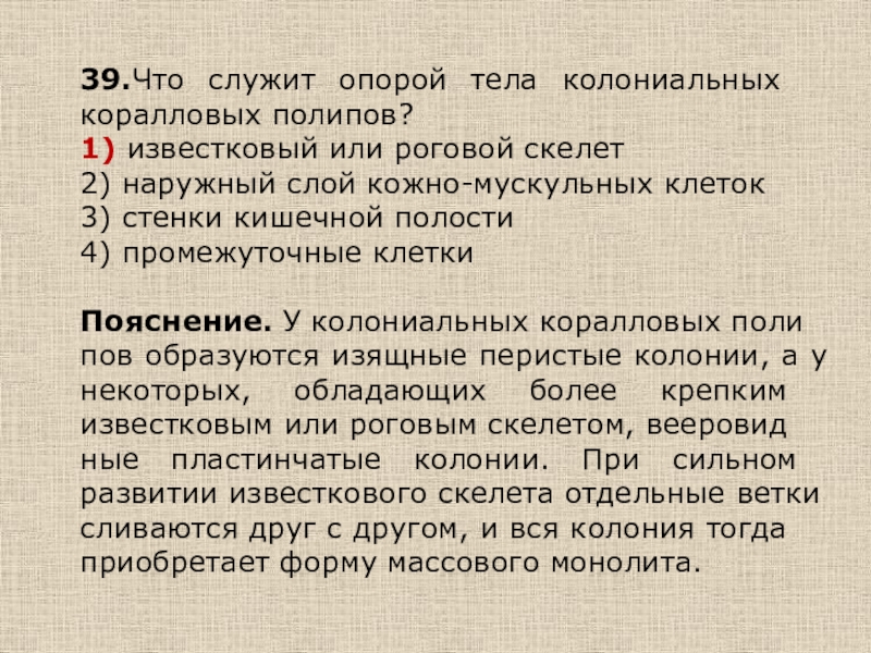 Слайд 6639.Что служит опорой тела колониальных коралловых полипов?