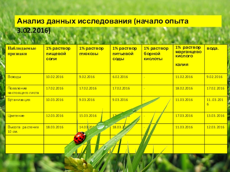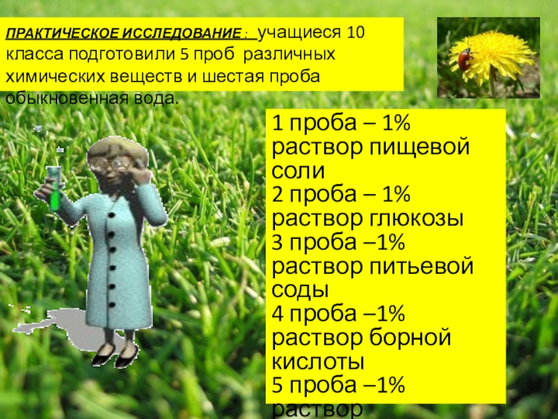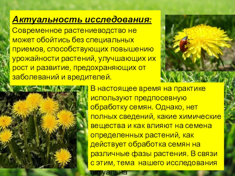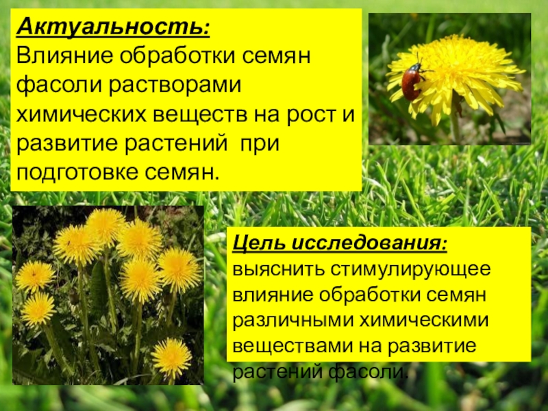 В настоящее время на практике используют предпосевную обработку семян. Однако, нет полных сведений, какие химические вещества и как влияют на семена определенных растений, как действует обработка семян на различные фазы растения. В связи с этим, тема нашего исследования актуальна