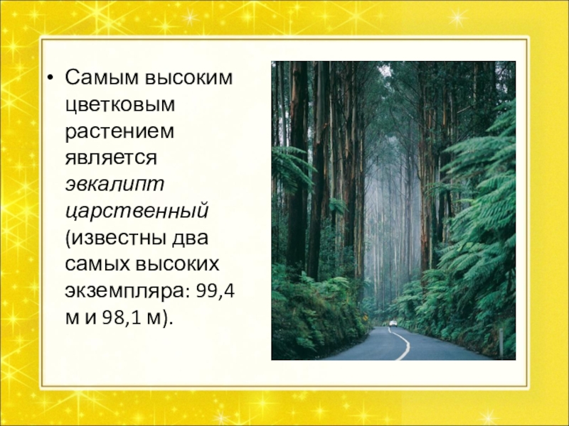 Слайд 12Самым высоким цветковым растением является эвкалипт царственный (известны два самых высоких