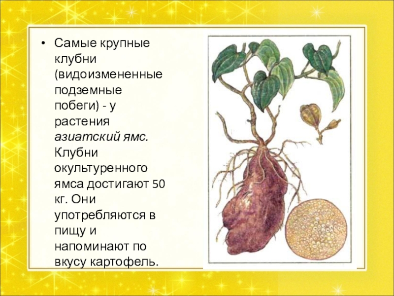 Слайд 11Самые крупные клубни (видоизмененные подземные побеги) - у растения азиатский ямс.