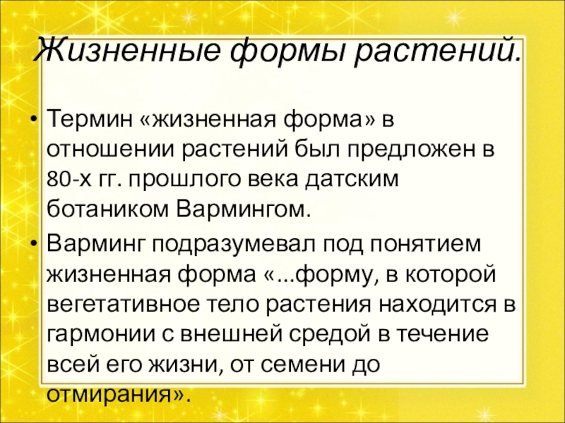 Варминг подразумевал под понятием жизненная форма «...форму, в которой вегетативное тело растения находится в гармонии с внешней средой в течение всей его жизни, от семени до отмирания».