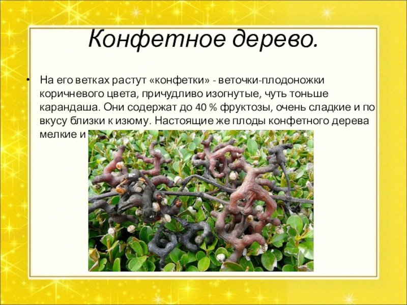 изогнутые, чуть тоньше карандаша. Они содержат до 40 % фруктозы, очень сладкие и по вкусу близки к изюму. Настоящие же плоды конфетного дерева мелкие и жесткие.