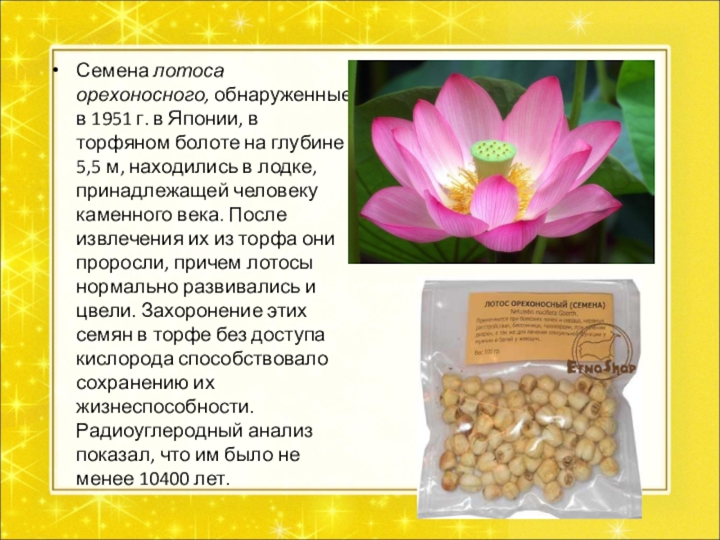 Слайд 10Семена лотоса орехоносного, обнаруженные в 1951 г. в Японии, в торфяном