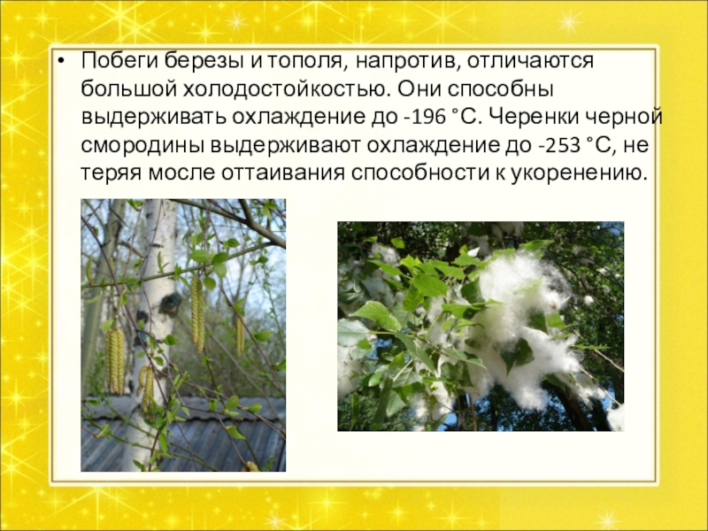 Слайд 14Побеги березы и тополя, напротив, отличаются большой холодостойкостью. Они способны выдерживать