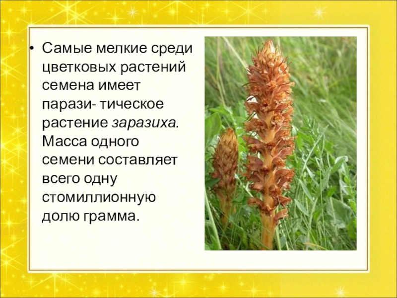 Слайд 9Самые мелкие среди цветковых растений семена имеет парази- тическое растение заразиха.