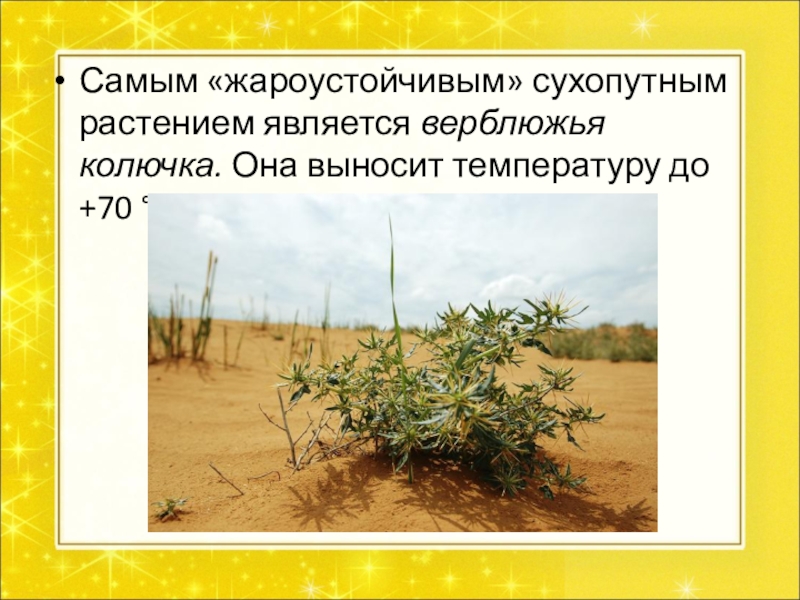 Слайд 13Самым «жароустойчивым» сухопутным растением является верблюжья колючка. Она выносит температуру до
