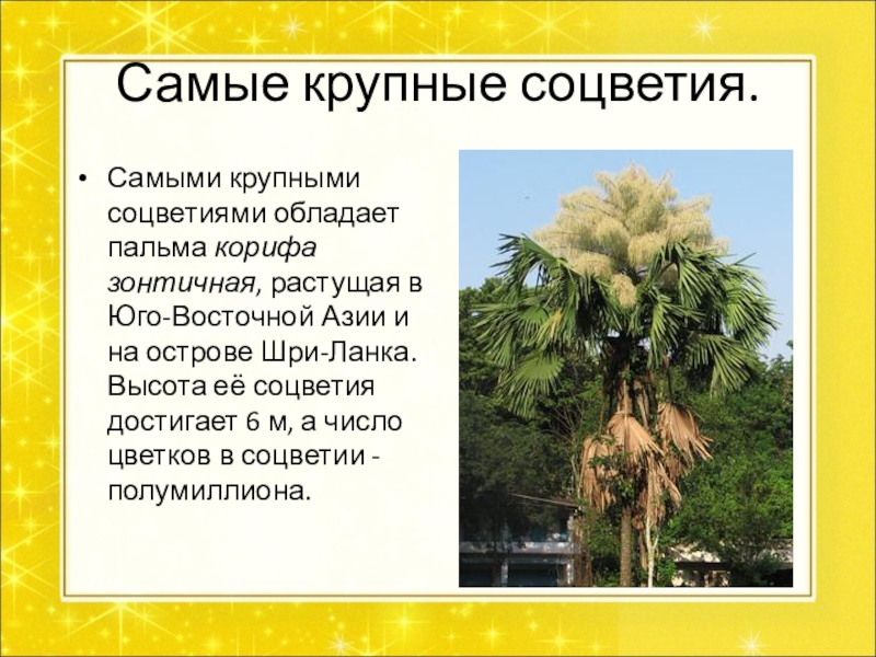 Самыми крупными соцветиями обладает пальма корифа зонтичная, растущая