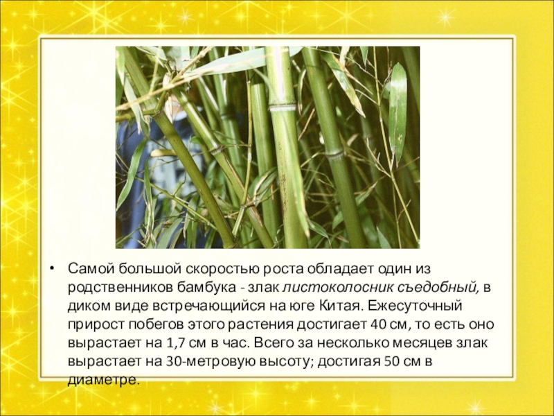 Слайд 15Самой большой скоростью роста обладает один из родственников бамбука - злак