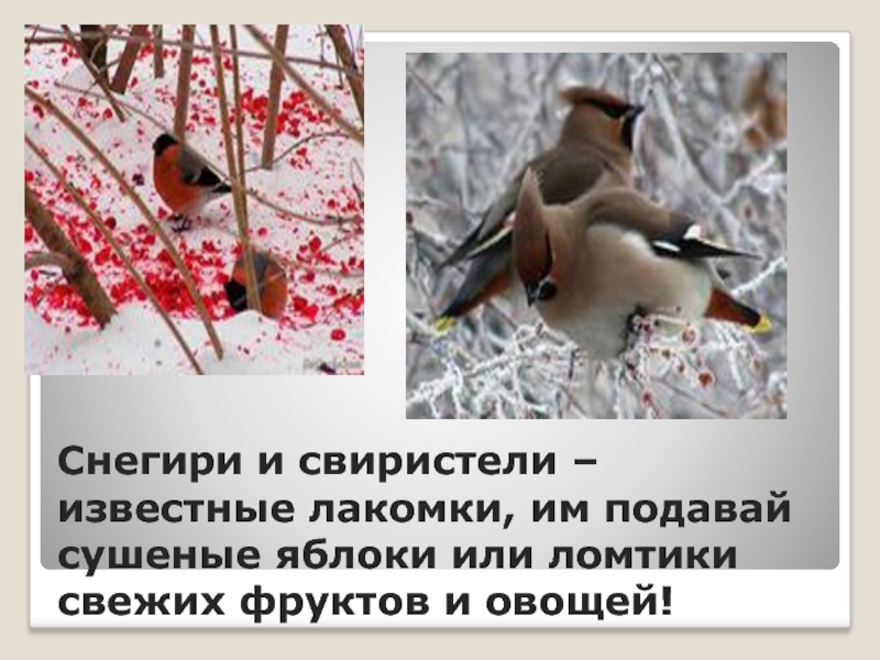 Слайд 9Снегири и свиристели – известные лакомки, им подавай сушеные яблоки или
