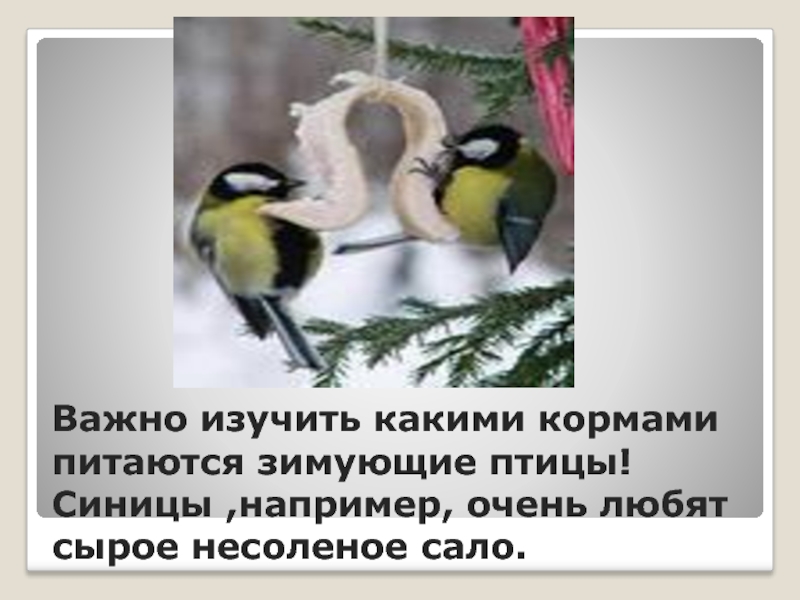 Слайд 6Важно изучить какими кормами питаются зимующие птицы! Синицы ,например, очень любят