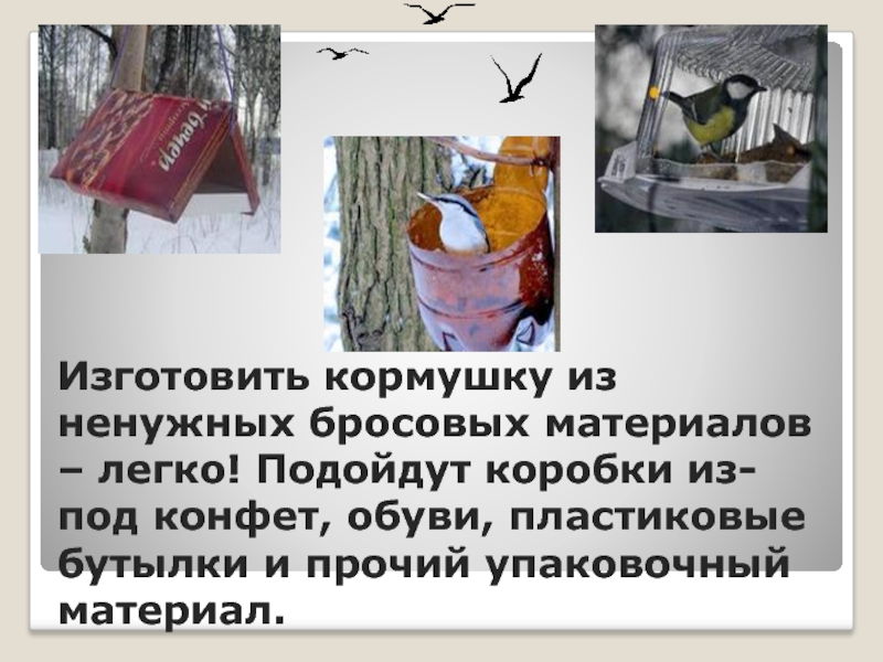 Слайд 5Изготовить кормушку из ненужных бросовых материалов – легко! Подойдут коробки из-под