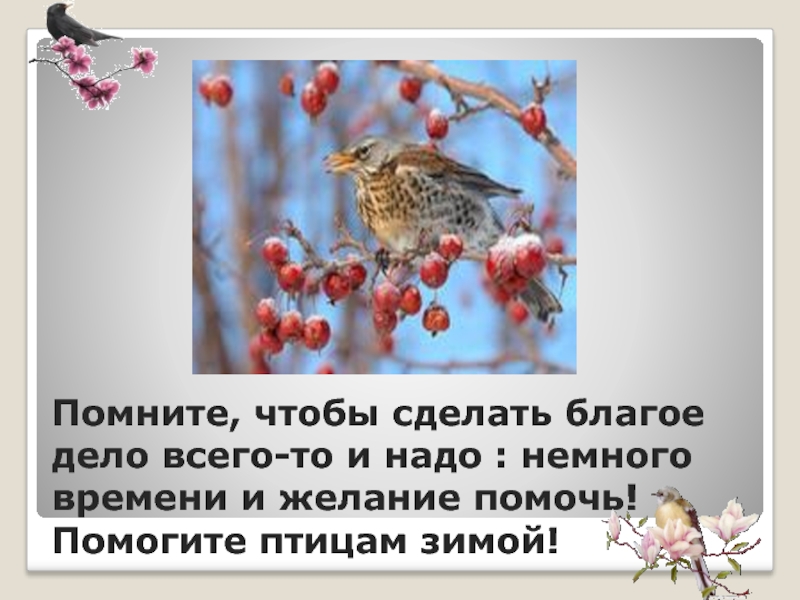 Помните, чтобы сделать благое дело всего-то и надо : немного времени и желание помочь! Помогите птицам зимой!