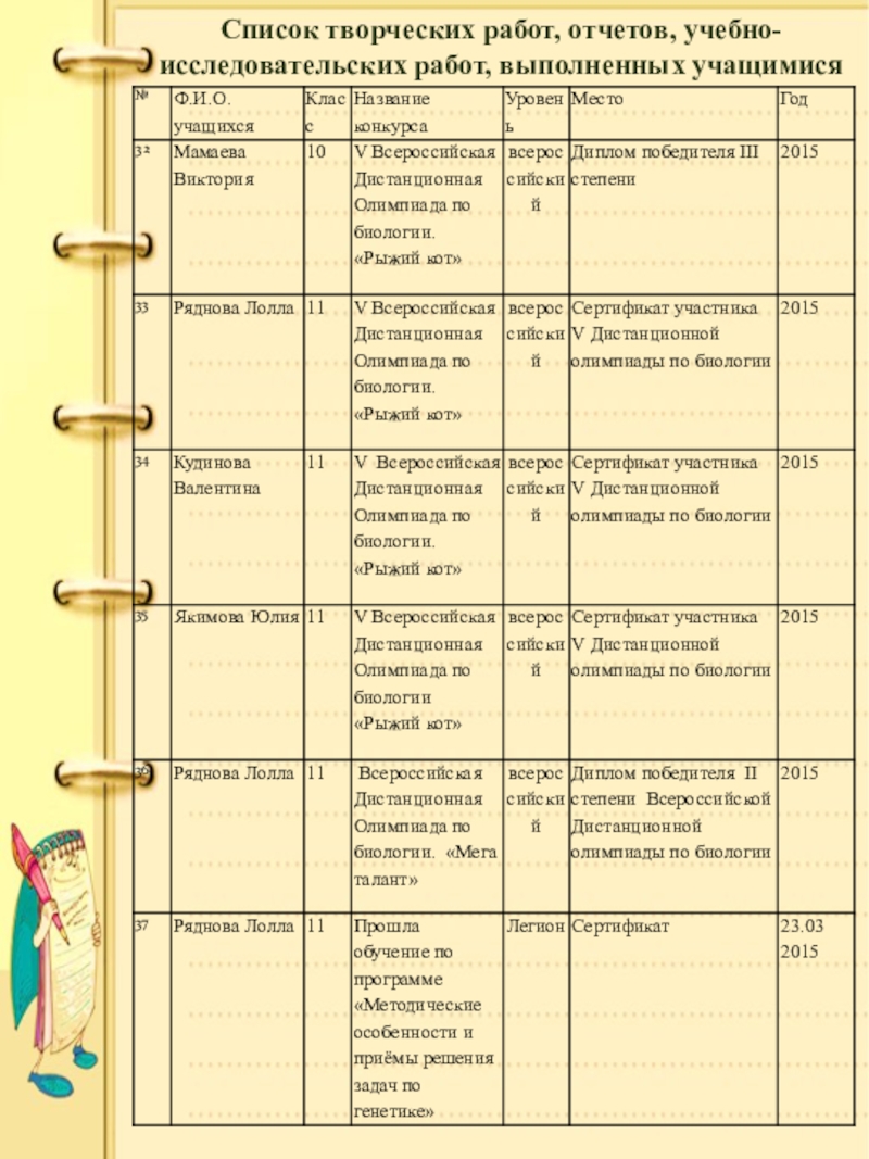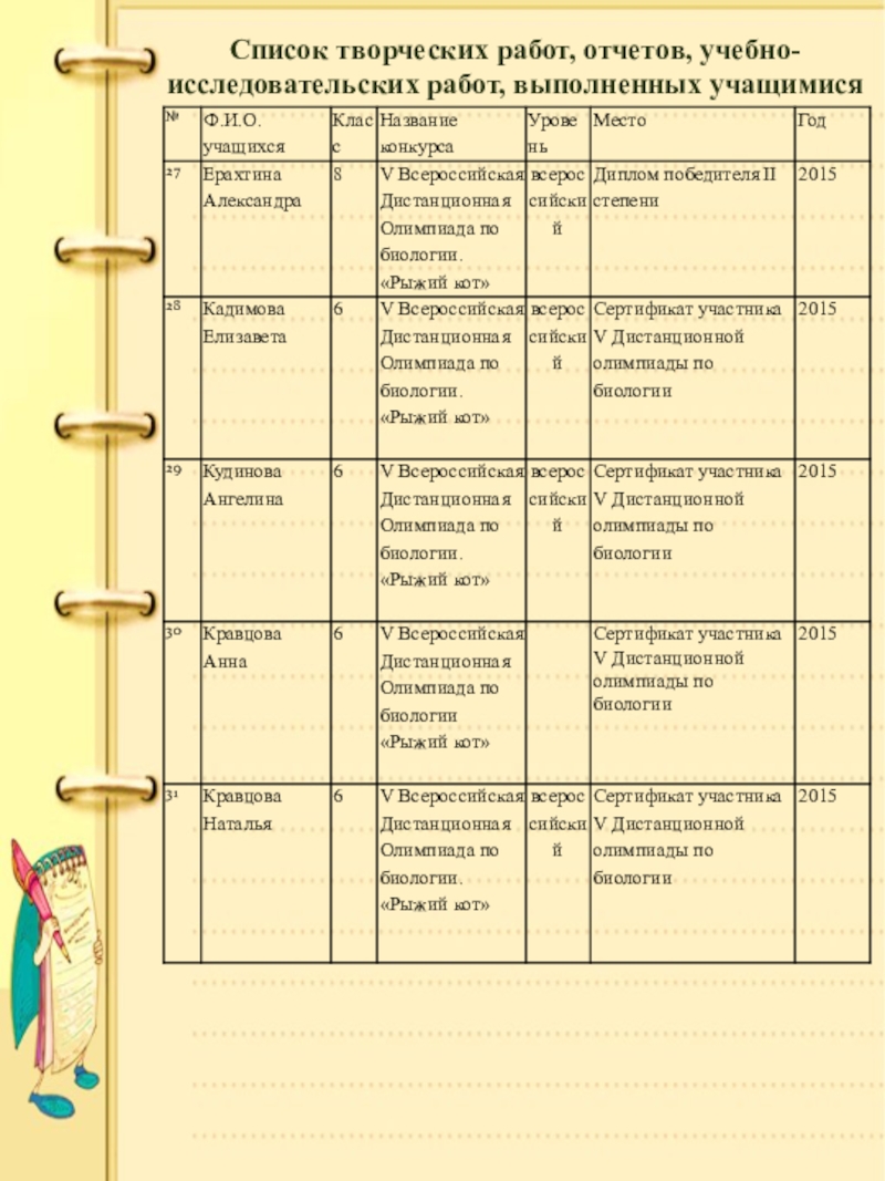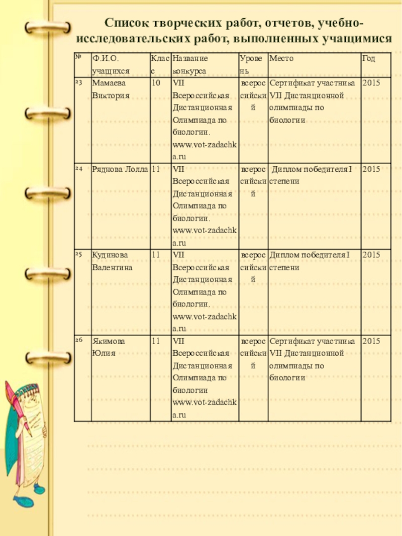 Слайд 23Список творческих работ, отчетов, учебно-исследовательских работ, выполненных учащимися