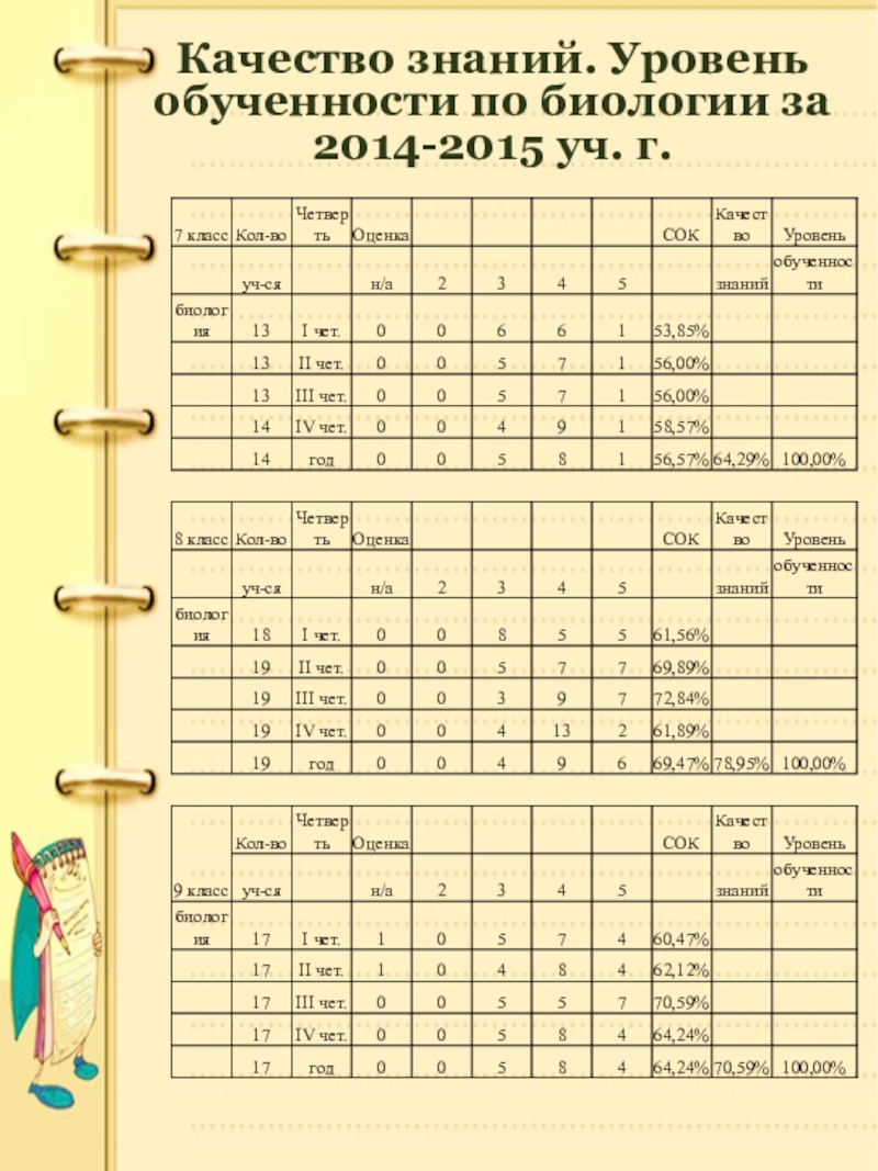 Слайд 11Качество знаний. Уровень обученности по биологии за 2014-2015 уч. г.