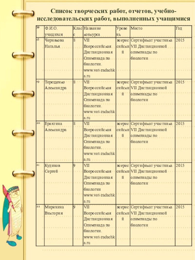 Слайд 22Список творческих работ, отчетов, учебно-исследовательских работ, выполненных учащимися