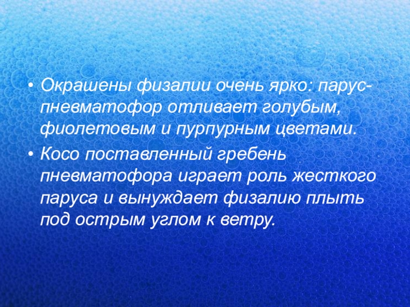Окрашены физалии очень ярко: парус-пневматофор отливает голубым, фиолетовым и пурпурным цветами.Косо поставленный гребень пневматофора играет роль жесткого