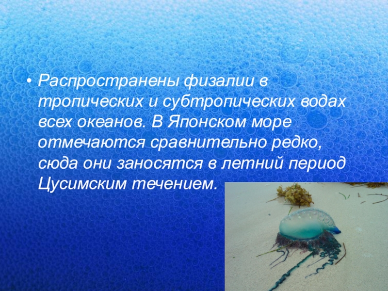 Распространены физалии в тропических и субтропических водах всех океанов. В Японском