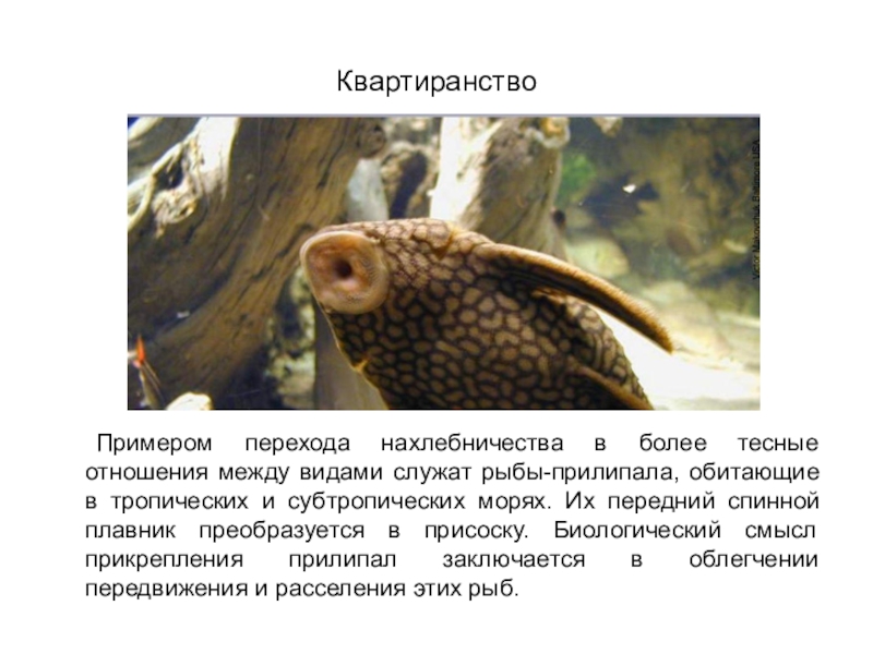 Примером перехода нахлебничества в более тесные отношения между видами служат рыбы-прилипала,