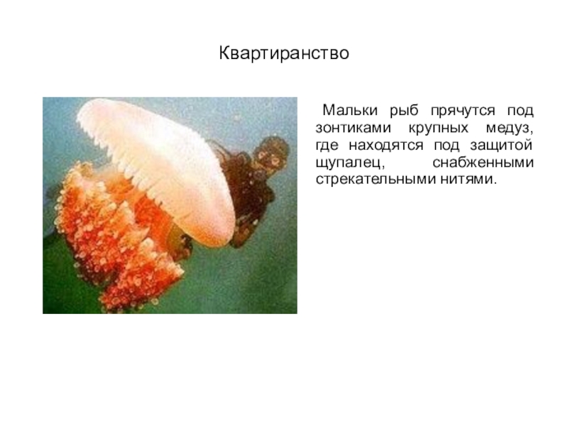 животных видов или их местообитания (постройки) служат убежищами. Эта форма взаимоотношений получило название квартиранство. В полости тела голотурии (тип Иглокожие), называемой так же морским огурцом, находят убежище разнообразные виды животных.