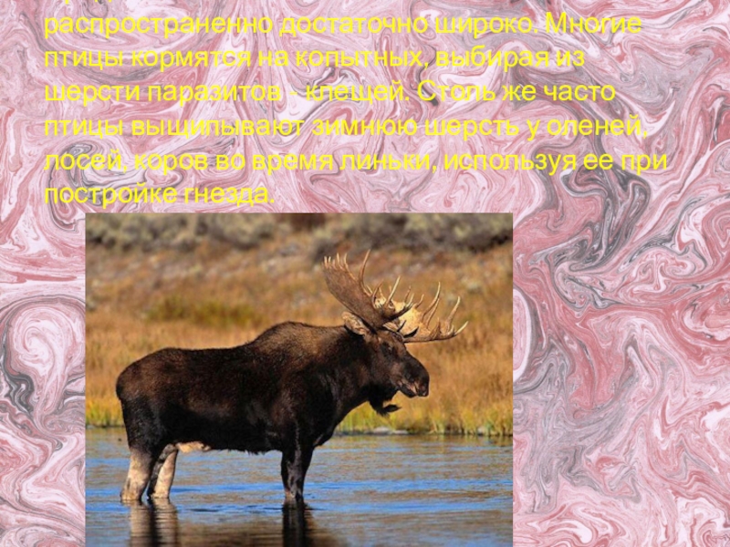 на копытных, выбирая из шерсти паразитов - клещей. Столь же часто птицы выщипывают зимнюю шерсть у оленей, лосей, коров во время линьки, используя ее при постройке гнезда.