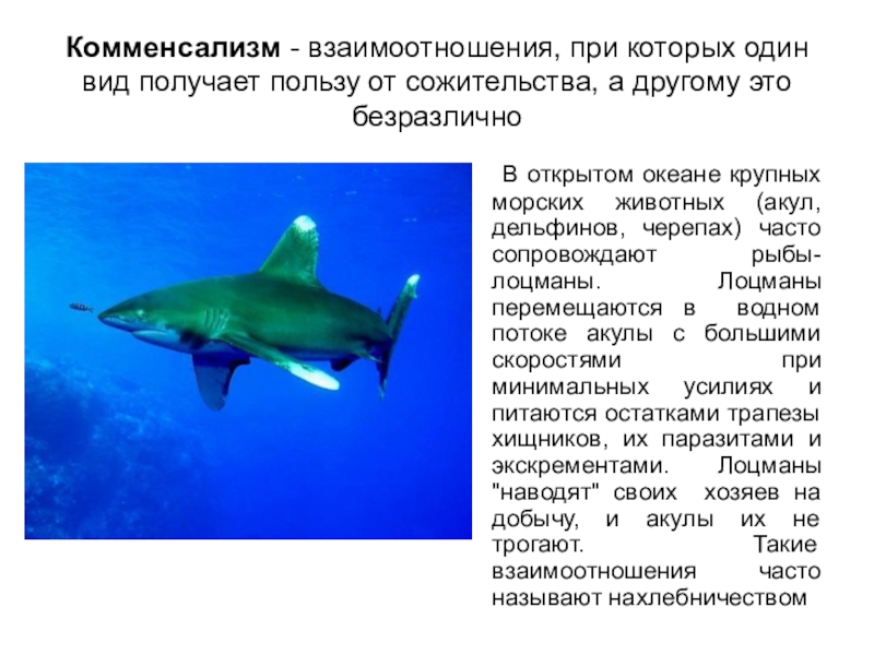 В открытом океане крупных морских животных (акул, дельфинов, черепах) часто сопровождают рыбы-лоцманы. Лоцманы перемещаются в водном потоке акулы с большими скоростями при минимальных усилиях и питаются остатками трапезы хищников, их паразитами и экскрементами. Лоцманы "наводят" своих хозяев на добычу, и акулы их не трогают. Такие взаимоотношения часто называют нахлебничеством