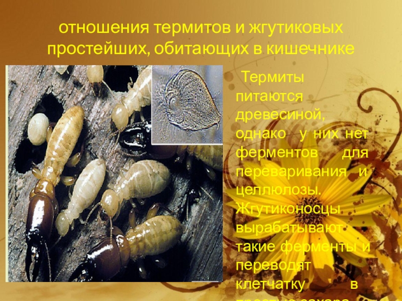 Слайд 12отношения термитов и жгутиковых простейших, обитающих в кишечнике
