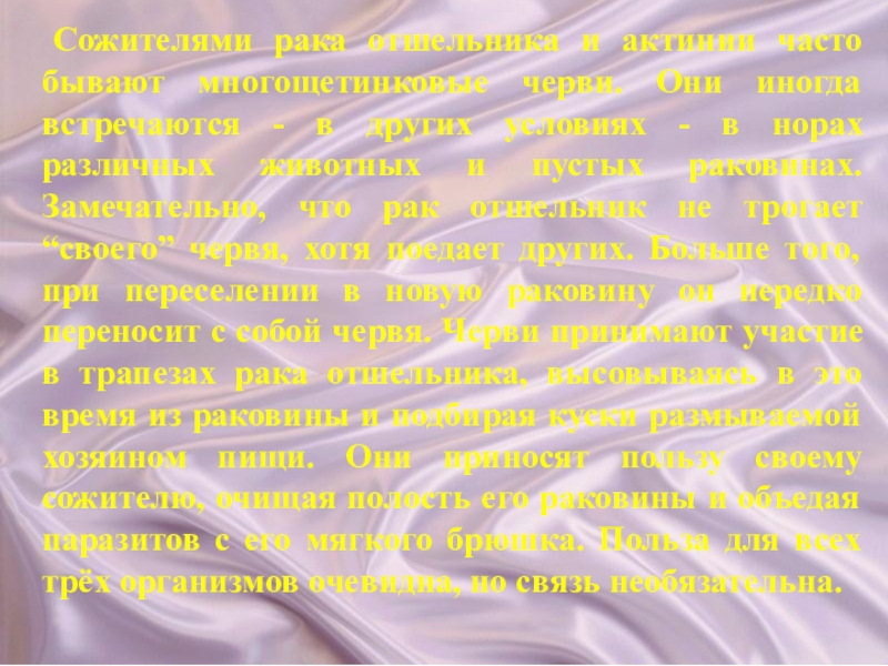 Сожителями рака отшельника и актинии часто бывают многощетинковые черви. Они иногда