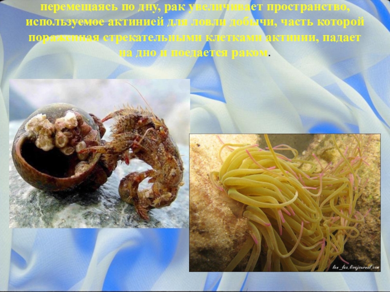 Слайд 4перемещаясь по дну, рак увеличивает пространство, используемое актинией для ловли добычи,