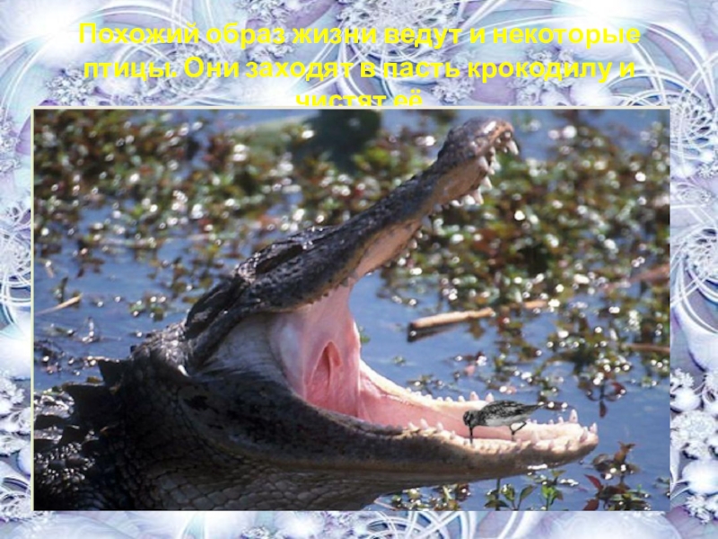 Слайд 8Похожий образ жизни ведут и некоторые птицы. Они заходят в пасть