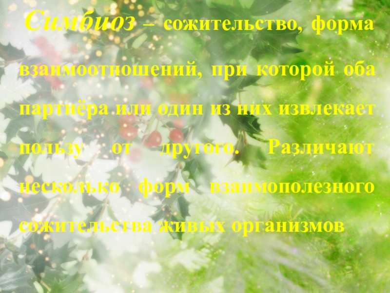 Слайд 2 Симбиоз – сожительство, форма взаимоотношений, при которой оба партнёра или один