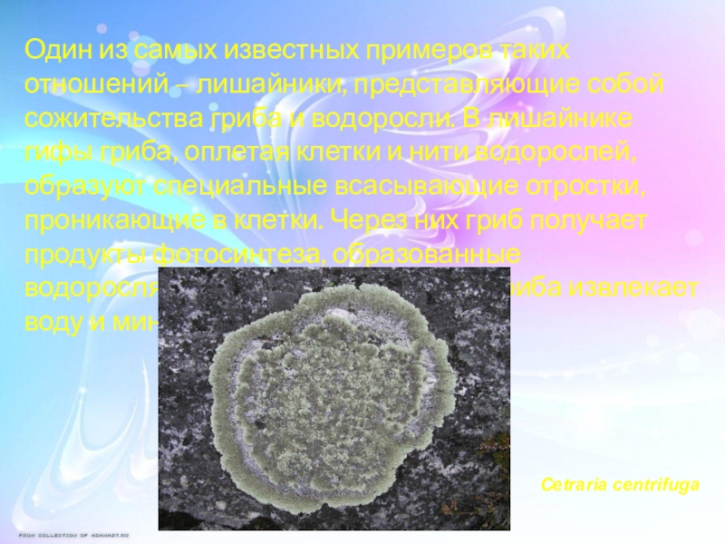 Слайд 11Один из самых известных примеров таких отношений – лишайники, представляющие собой