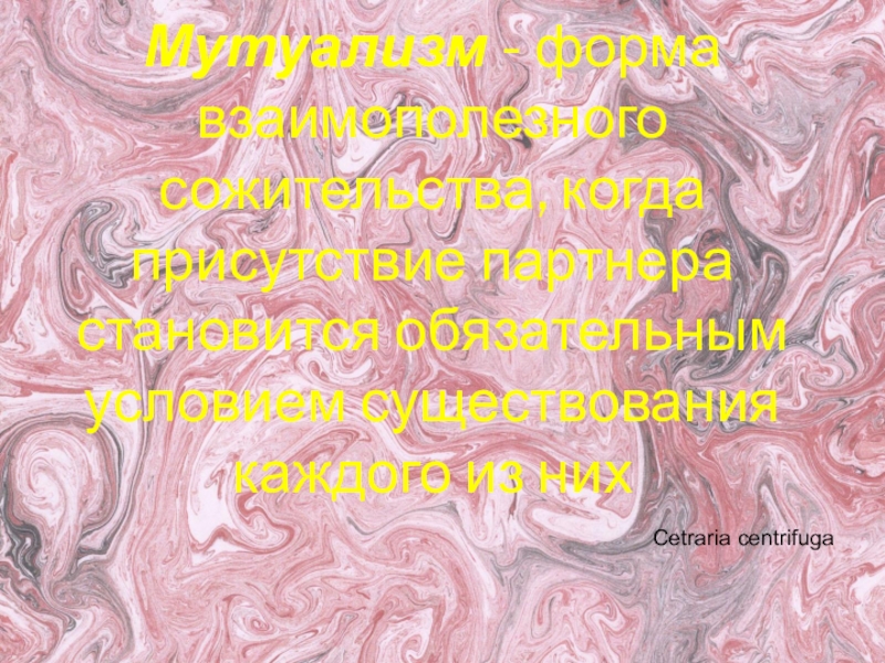 Слайд 10Мутуализм - форма взаимополезного сожительства, когда присутствие партнера становится обязательным условием