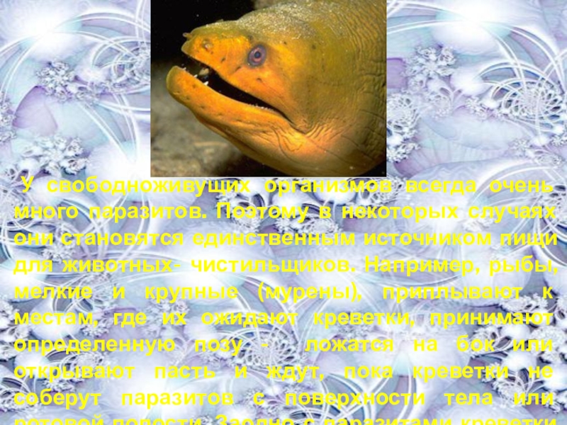 они становятся единственным источником пищи для животных- чистильщиков. Например, рыбы, мелкие и крупные (мурены), приплывают к местам, где их ожидают креветки, принимают определенную позу - ложатся на бок или открывают пасть и ждут, пока креветки не соберут паразитов с поверхности тела или ротовой полости. Заодно с паразитами креветки выстригают клешнями поврежденные отмершие ткани.