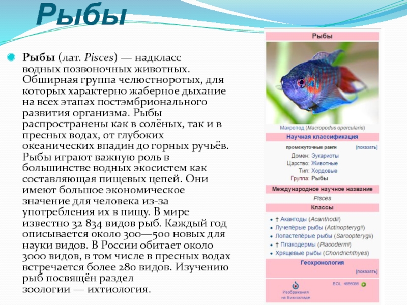 этапах постэмбрионального развития организма. Рыбы распространены как в солёных, так и в пресных водах, от глубоких океанических впадин до горных ручьёв. Рыбы играют важную роль в большинстве водных экосистем как составляющая пищевых цепей. Они имеют большое экономическое значение для человека из-за употребления их в пищу. В мире известно 32 834 видов рыб. Каждый год описывается около 300—500 новых для науки видов. В России обитает около 3000 видов, в том числе в пресных водах встречается более 280 видов. Изучению рыб посвящён раздел зоологии — ихтиология.