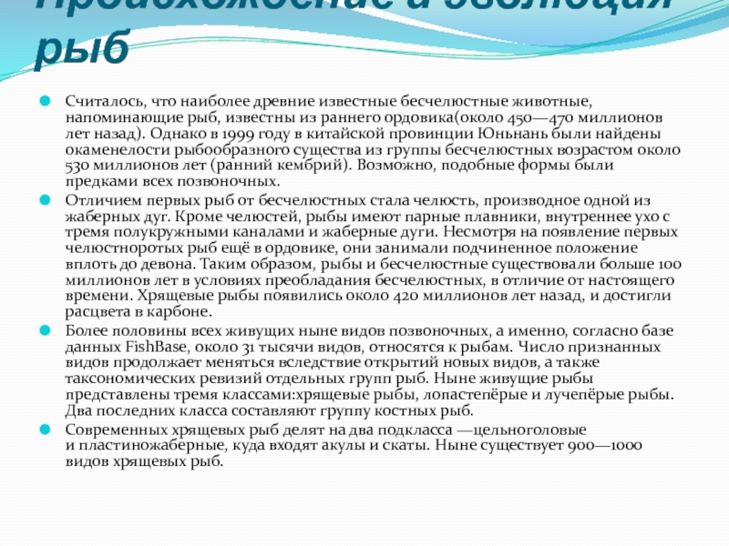 рыб, известны из раннего ордовика(около 450—470 миллионов лет назад). Однако в 1999 году в китайской провинции Юньнань были найдены окаменелости рыбообразного существа из группы бесчелюстных возрастом около 530 миллионов лет (ранний кембрий). Возможно, подобные формы были предками всех позвоночных.