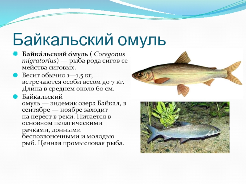 Байкальский омуль — эндемик озера Байкал, в сентябре — ноябре заходит на нерест в реки. Питается в основном пелагическими рачками, донными беспозвоночными и молодью рыб. Ценная промысловая рыба.