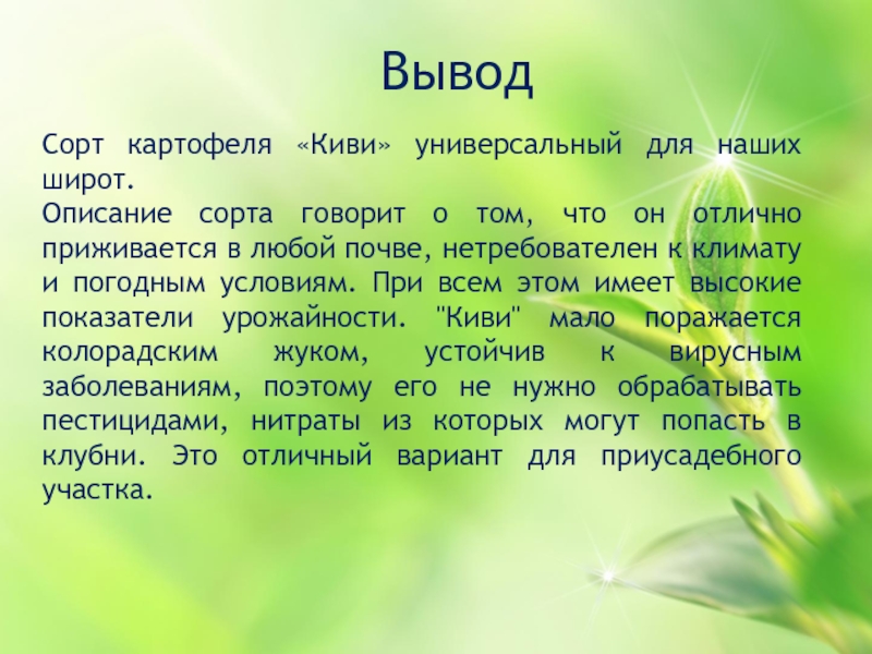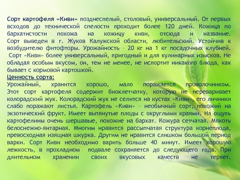 Слайд 13Сорт картофеля «Киви» универсальный для наших широт.